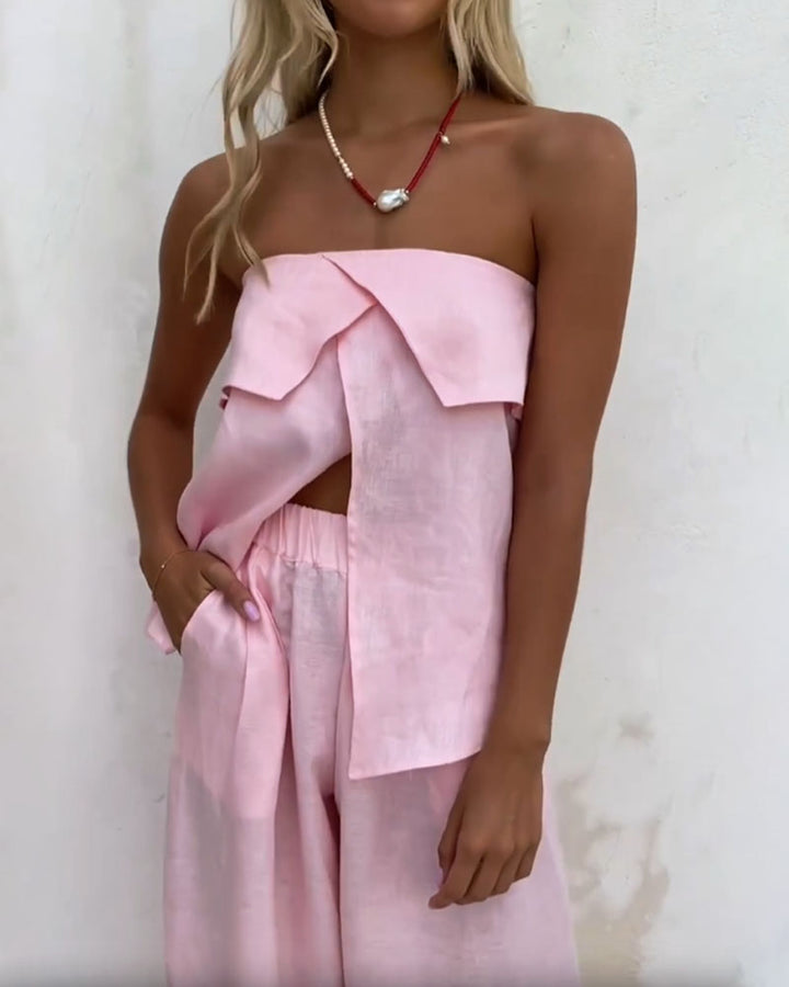 Casual Solid Color Strapless Split Top & Pants Two-Piece Set