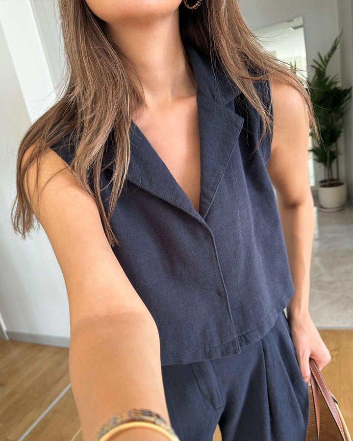 Casual Solid Lapel Vest & Pants Cotton Linen Two-piece Set
