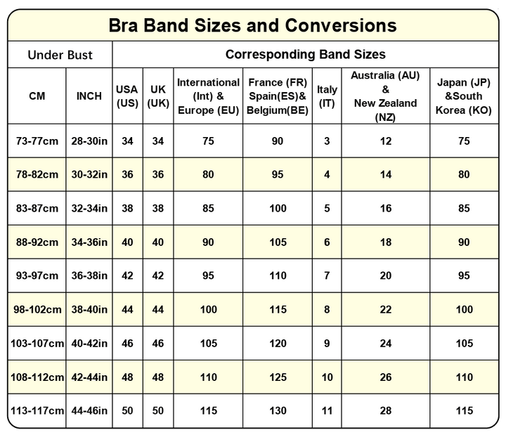Answer: Step 1,Measure your band size Place the measuring tape around your ribcage, right underneath the band of your bra.Make sure it is pulled tight but is not uncomfortable and that the tape is level.Make a note of how many inches you are.If you land on an even number this is your band size.If you land on an odd number, you’ll want to round up or round down to the nearest even number based on your build. Step 2,Measure your bust size Place the measuring tape around the fullest part of your bust(at nipple level),making sure to hold the measuring tape snugly against you and parallel to the ground. You won’t need to pull the tape particularly tight for this measurement it just needs to sit flat.Make a note of how many inches you are.If it falls on the half-inch, just round up. That’s your bust size! Step 3,Determine Your Cup Size Minus your band size from your cup size and make a note of this value.This difference indicates your cup.Example: 37 inches (bust) – 34 inches (band) = 3 inches. That's a 34C. 0=AA , 1=A, 2=B, 3=C, 4=D, 5=DD(E),6=DDD(F), 7=G