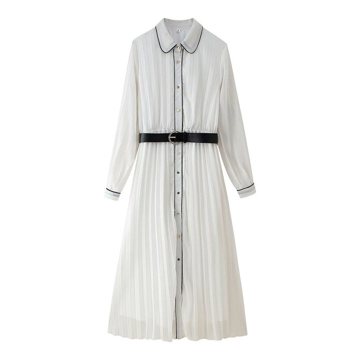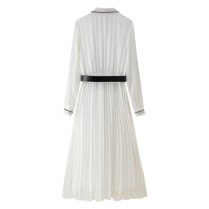 Elevate your wardrobe with this stunning white pleated dress, designed to blend timeless elegance with modern sophistication. Crafted for the modern woman, this piece features vertical pleats that flow gracefully from the waist to mid-calf, creating a dynamic yet understated silhouette. Subtle black trim accents the collar, cuffs, and a wide cinching belt, adding polished contrast to the crisp white fabric. Whether you’re attending a wedding, dinner party, or special event, this dress balances versatility and refinement, making it a go-to choice for any occasion that demands effortless style.