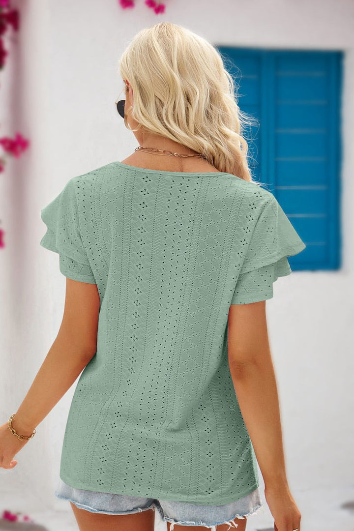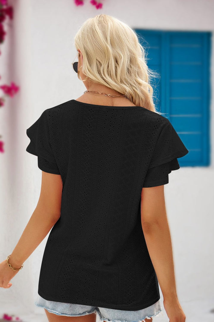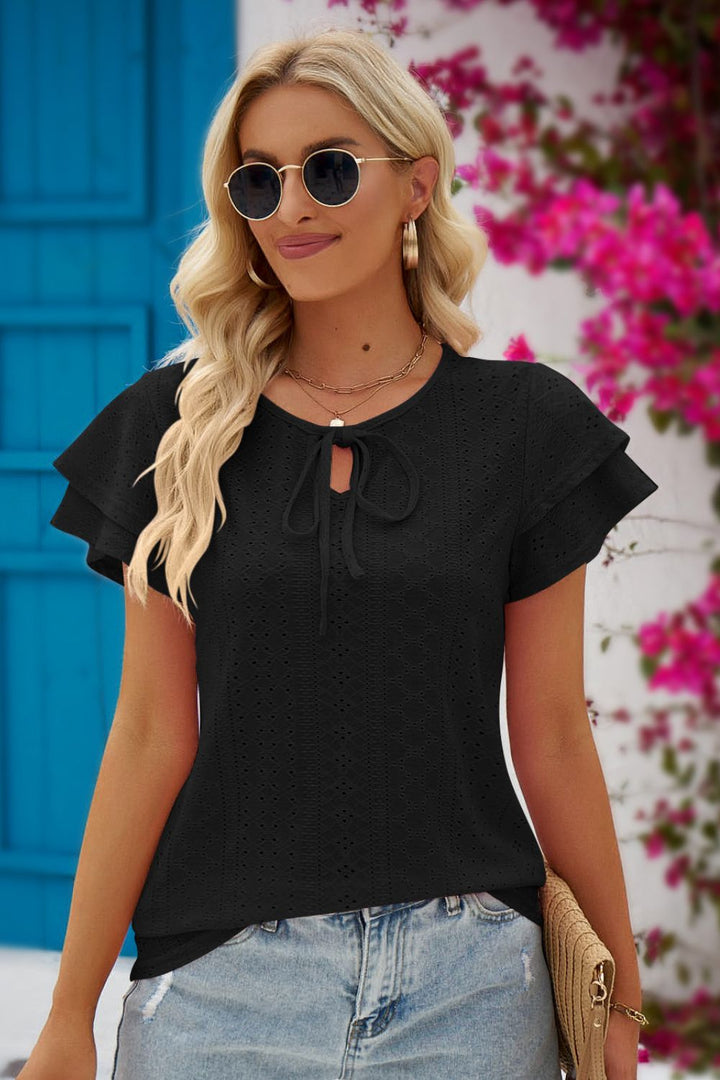 Eyelet Tie-Neck Flutter Sleeve Blouse