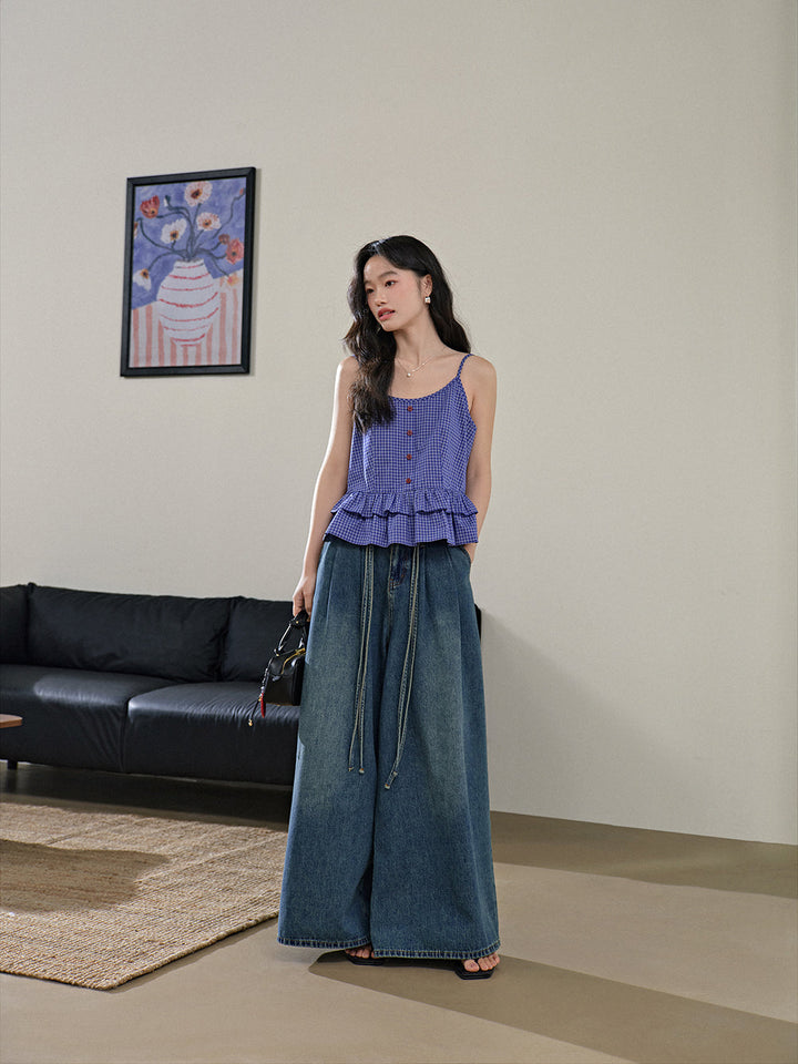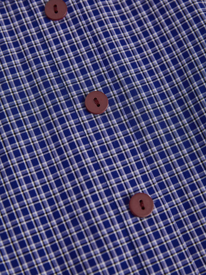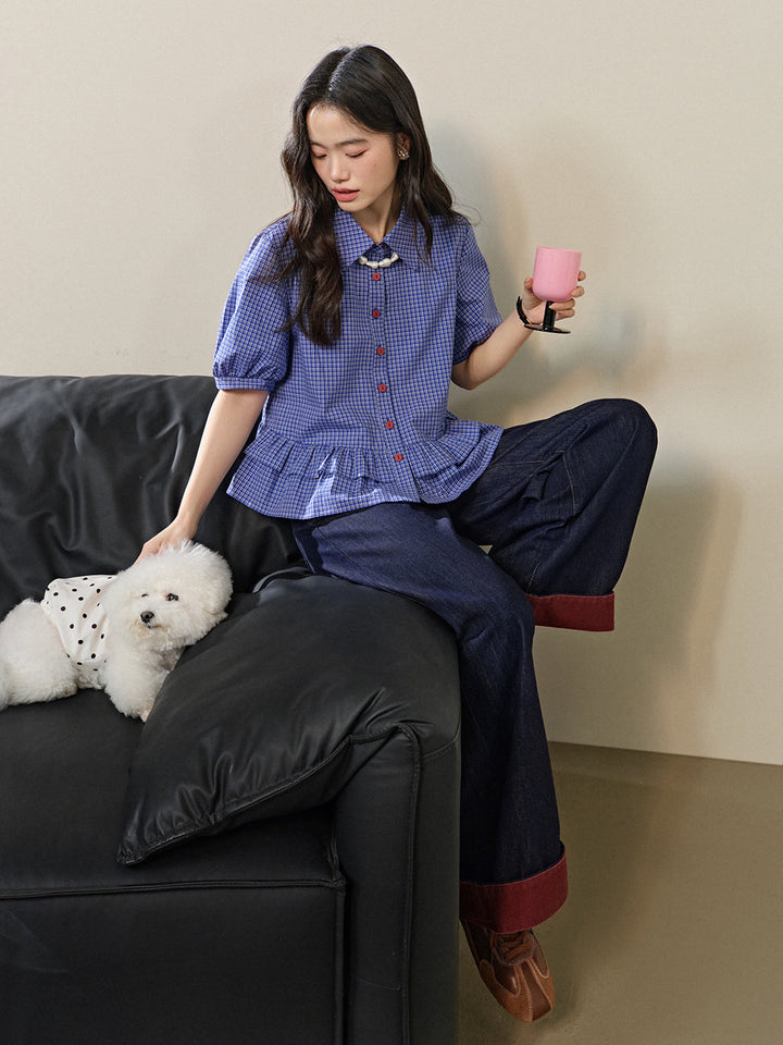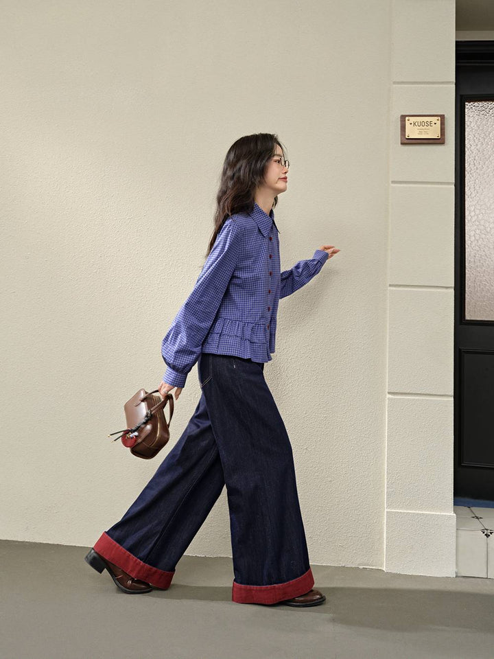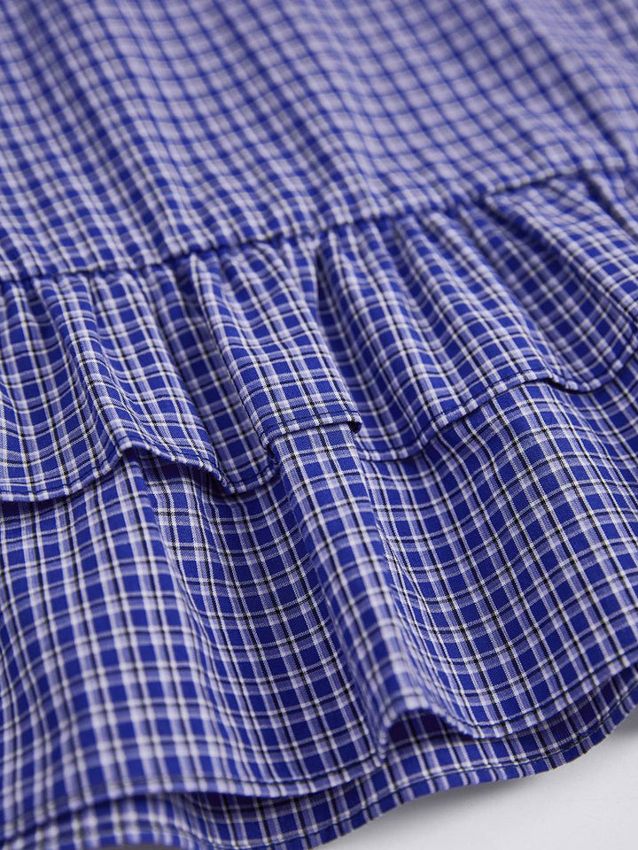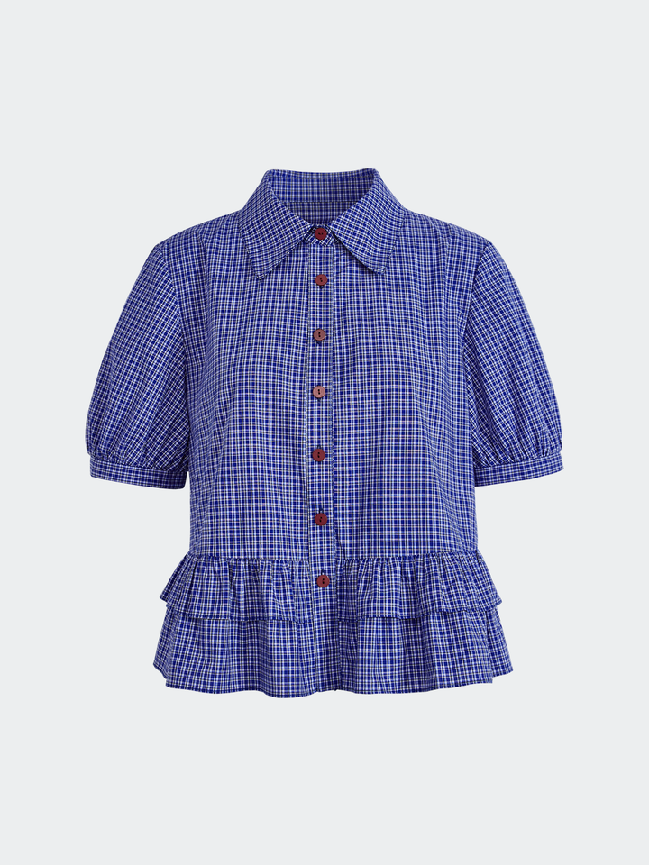 Embrace the essence of Parisian chic with our Blue Plaid Ruffle Blouse - a cropped reinterpretation of classic shirting for the modern fashion muse. Featuring delicate ruffled sleeves and a flattering boxy silhouette, this 100% cotton gem elevates basic blue plaid into high-fashion statement. The intentionally cropped length (hits at natural waist) creates perfect proportions for tucking or pairing with high-waisted pieces. Meticulously detailed with mother-of-pearl buttons and French seams for effortless sophistication.