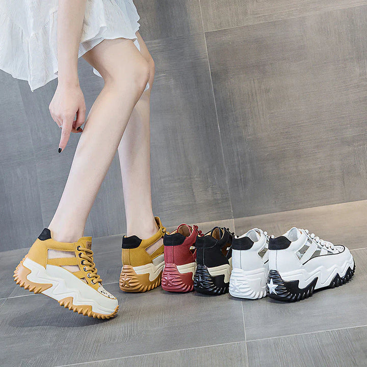 Thick-heeled sneakers ergonomically designed for effective pressure relief on the feet.